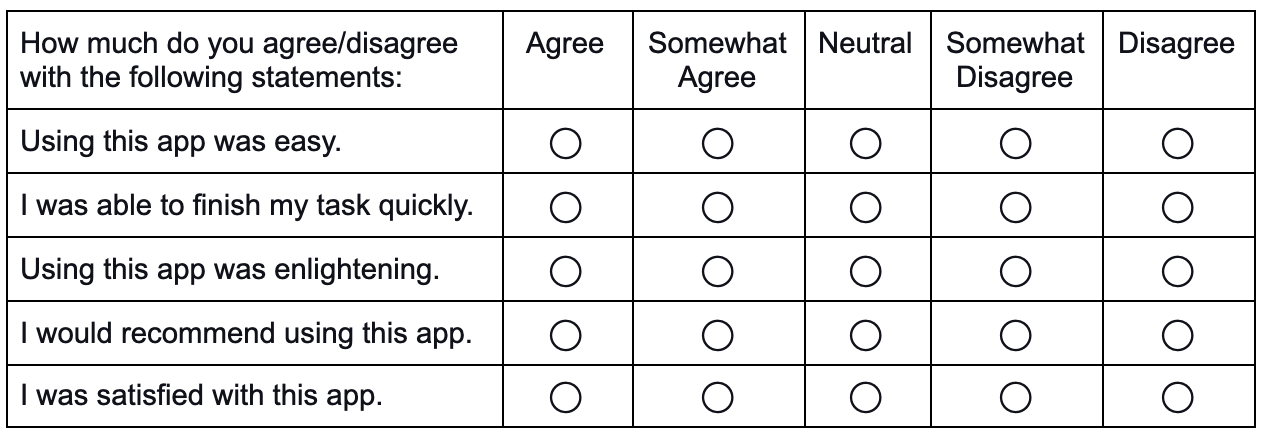 If you have the benefit of not using NPS, you have a plethora of options available to you. Decide the single most crucial factor your app needs users to achieve (ease, quickness, happiness, enlightenment, etc.) and devise a question around it. You can use a 5 point scale such as the question above, or you can use a 7 point scale such as this: